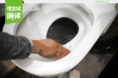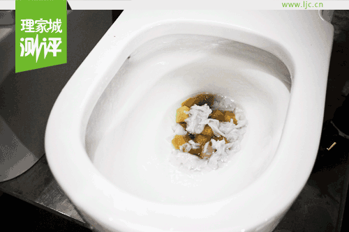 現場小編用玻璃屑、100個聚丙烯球一個管道球、海綿紙巾模擬各種排泄物進行了沖水試驗,在漩轉瀑布水流、優(yōu)良陶瓷管道的配合下,噴射式水流瞬間將玻璃屑、高爾浮球、海綿紙巾等堵塞物吸走,沖力十足。