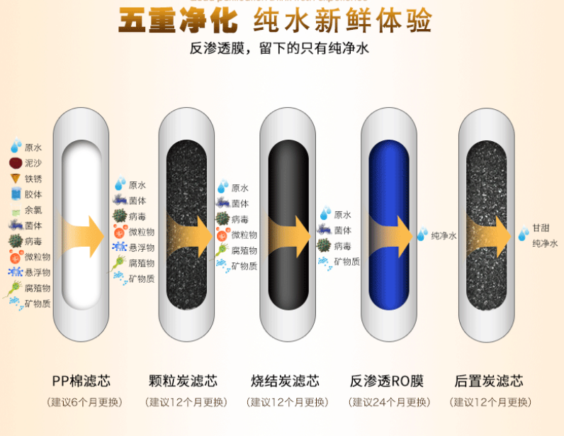 :孔徑0.1納米,清除水中細菌、病毒、重金屬、等有機雜質(zhì)。