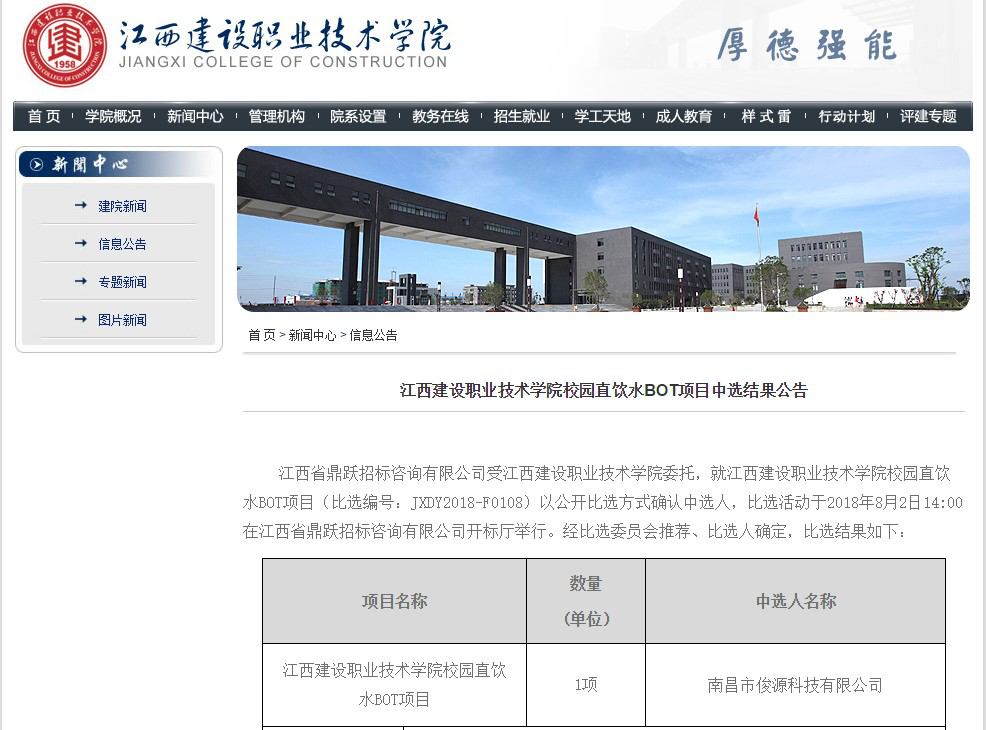 近日,由江西省鼎躍招標咨詢(xún)有限公司受江西建設職業(yè)技術(shù)學(xué)院委托組織公開(kāi)比選,江西建設職業(yè)技術(shù)學(xué)院校園直飲水BOT項目,南昌俊源科技有限公司憑借過(guò)硬的產(chǎn)品質(zhì)量、豐富的校園直飲水工程項目經(jīng)驗和完善的售后服務(wù)體系,贏(yíng)得評委的一致認可,在眾多品牌中脫穎而出,中標成功!